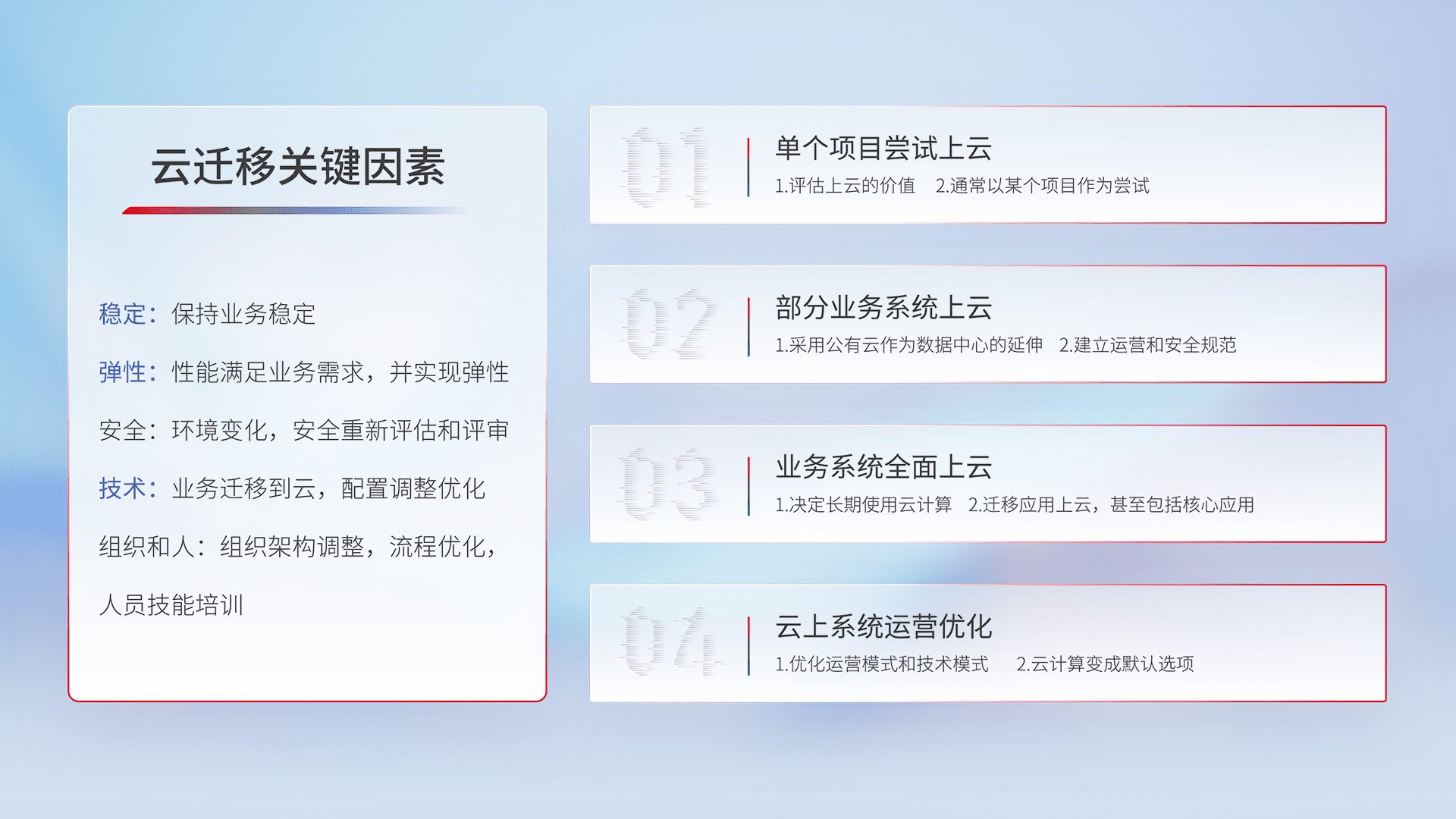 结合实际业务,,从规划设计、、、、云平台选型、、云原生改造、、数据迁移、、、、集成交付,,,,迁移全过程为客户识别最佳上云路径,,做好风险识别管理,,,设计网络架构、、身份权限、、、安全审计合规、、、操作审计、、日志审计、、、、监控告警策略、、、多站点容灾设计等,,对云上基础设施进行整体规划,,,,提升IT治理水平,,以满足弹性、、高可用、、、、高性能的需求。。。。