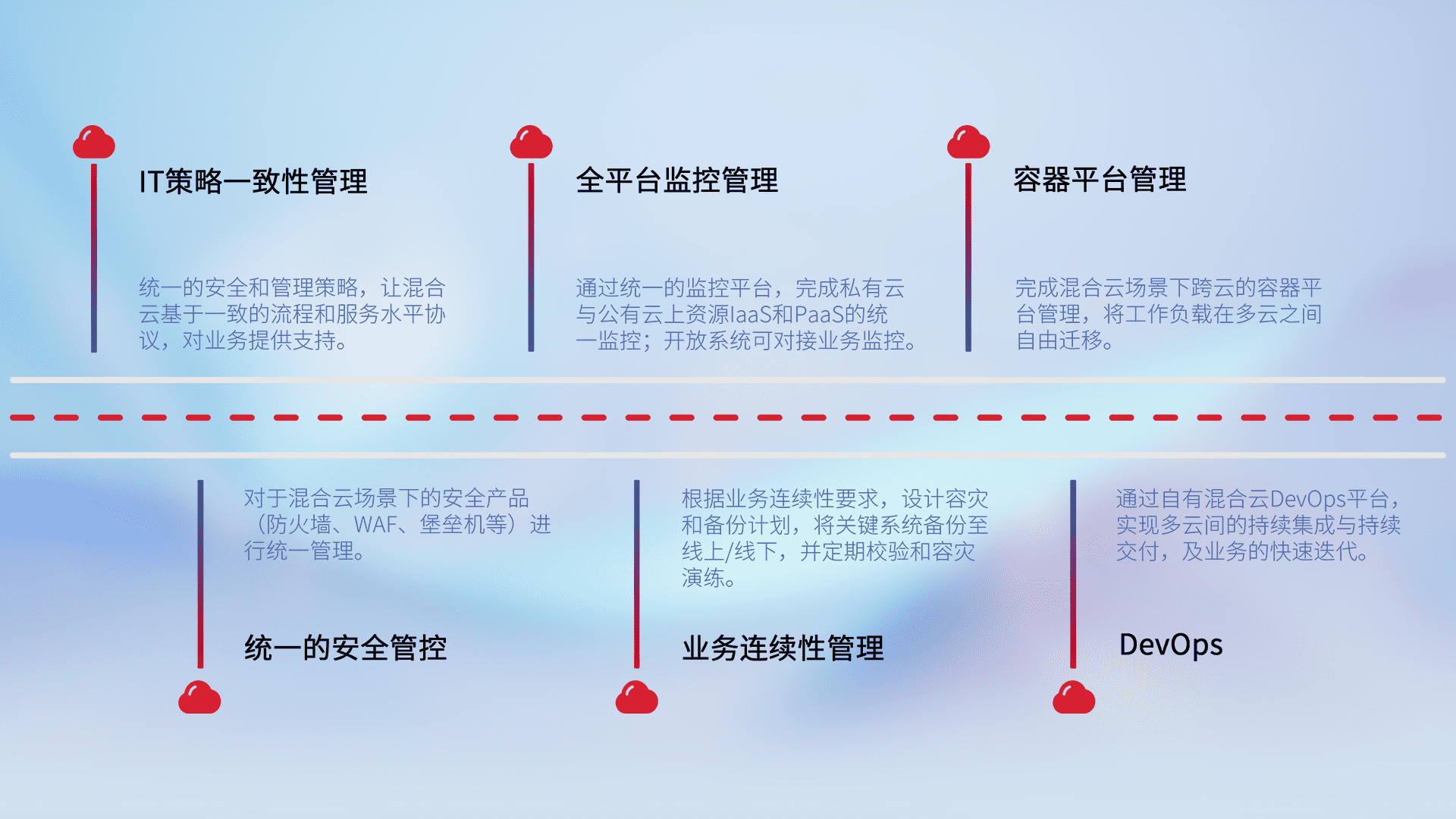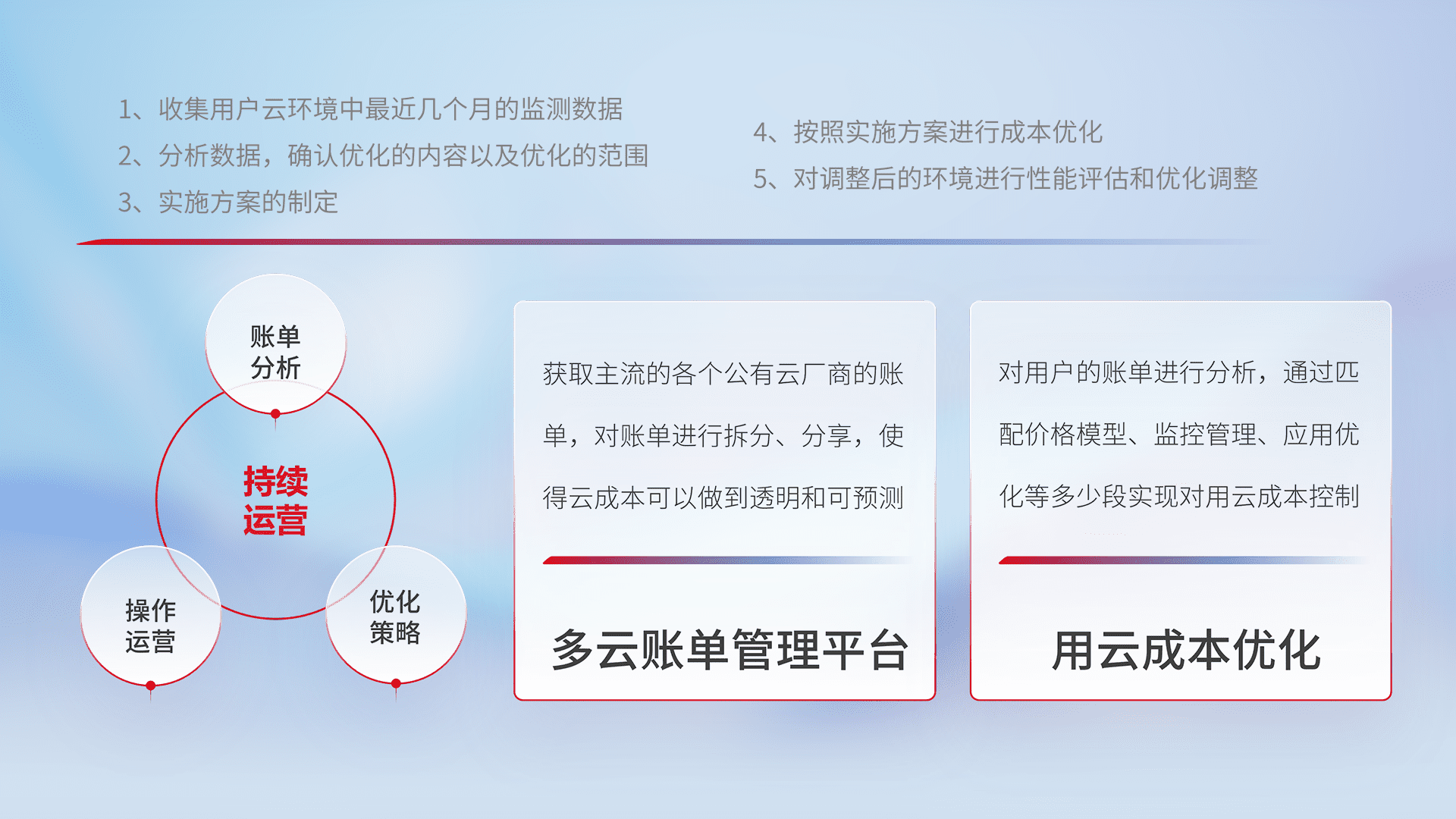 通过多云纳管,,,,以统一的资源数据模型把客户的云资源进行抽象和封装,,,进而实现对多云资源的统一操作,,,,保障云资源管理的可靠性、、、稳定性与可用性。。。。量身定制化运维内容,,配置、、、开发运维、、、、补丁管理、、、备份、、、、监控、、、、认证和访问管理、、审计和日常巡检等,,保障在用云过程中的可靠度,,,,稳定度以及高可用率。。。。