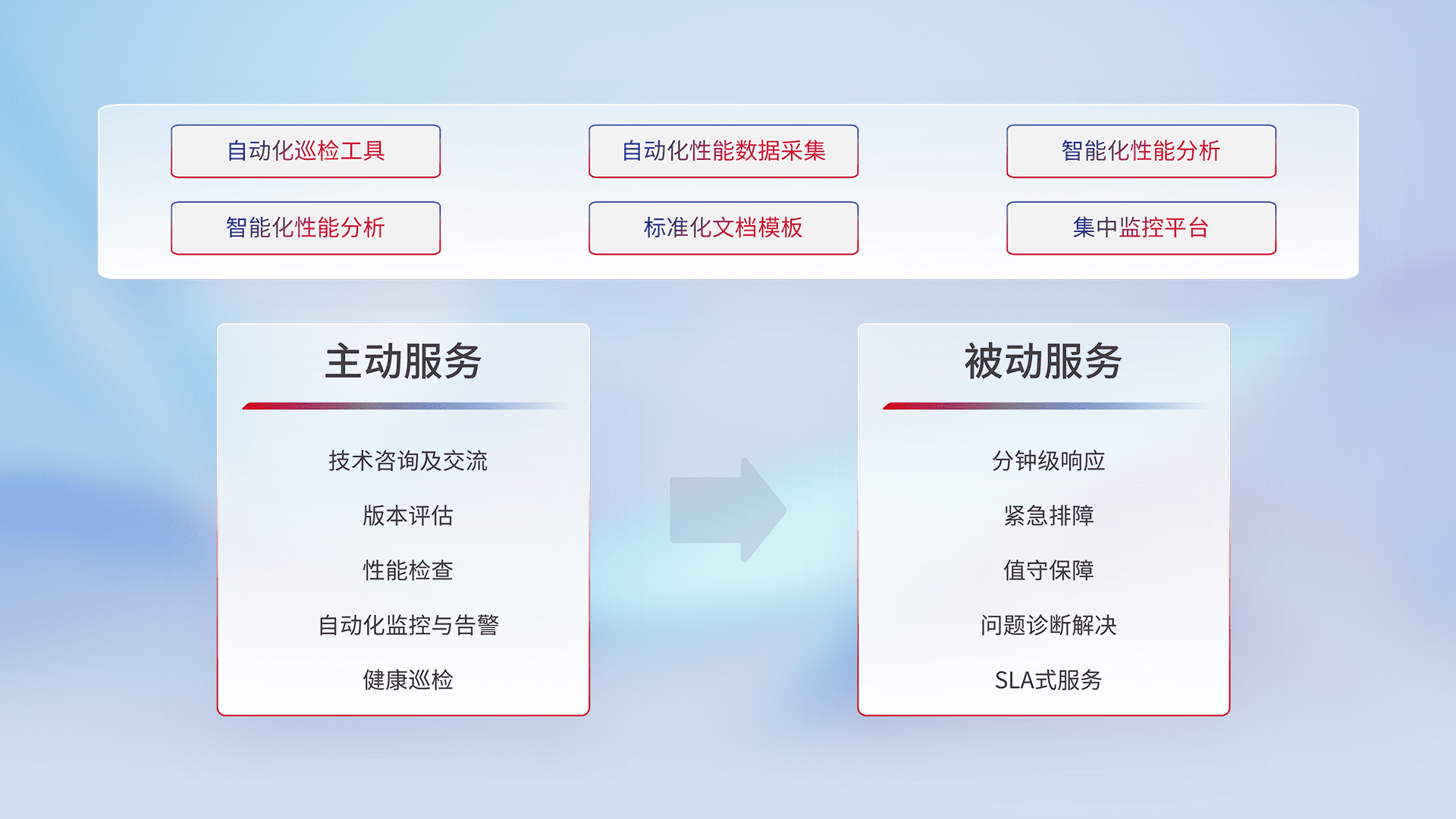 智能化工具和标准化文档,,,,保障服务质量,,,提供主动服务(包含技术咨询、、版本评估、、、、性能检查、、自动化监控与告警、、健康巡检)和被动服务包含(分钟级响应、、、、紧急排障、、、、值守保障、、、问题诊断解决、、、、SLA服务)。。。。